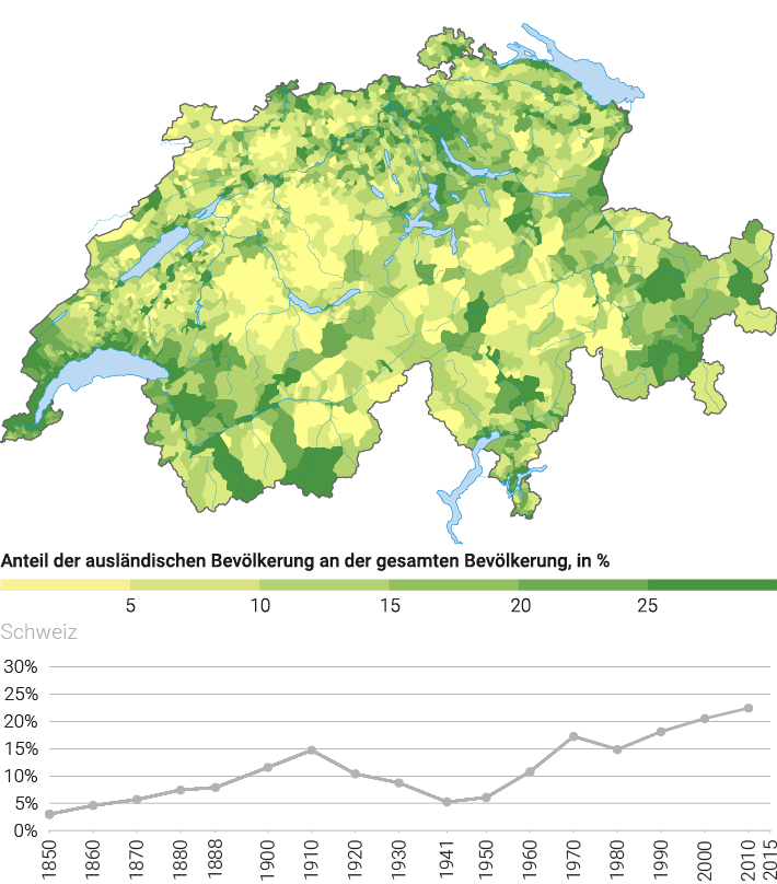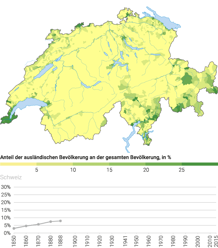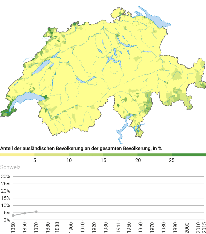 In der animierten Karte sind die Ausländeranteile in den Gemeinden für die Volkszählungsjahre seit 1850 dargestellt. Sie zeichnet ein räumlich detailliertes Bild der Entwicklung der ausländischen Bevölkerung in der Schweiz.