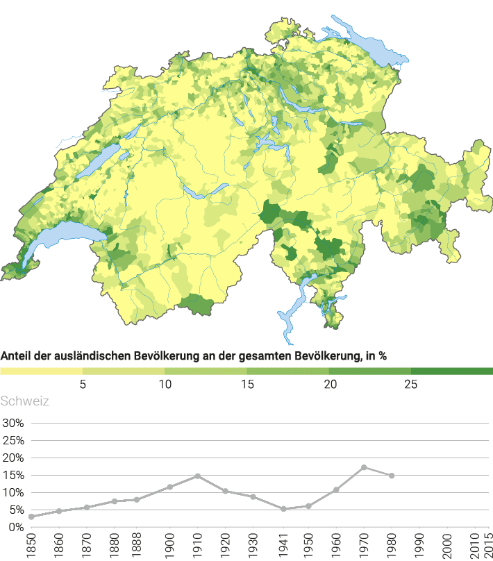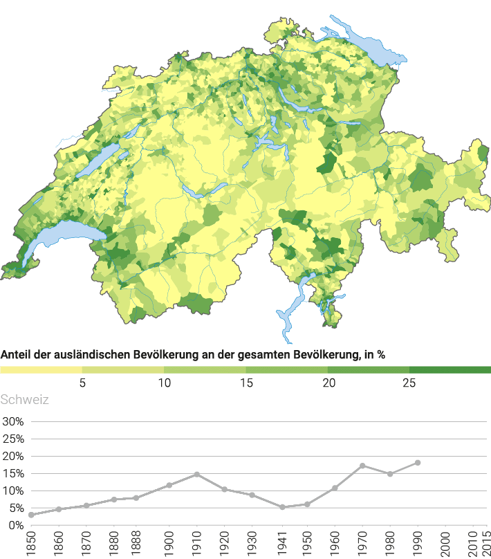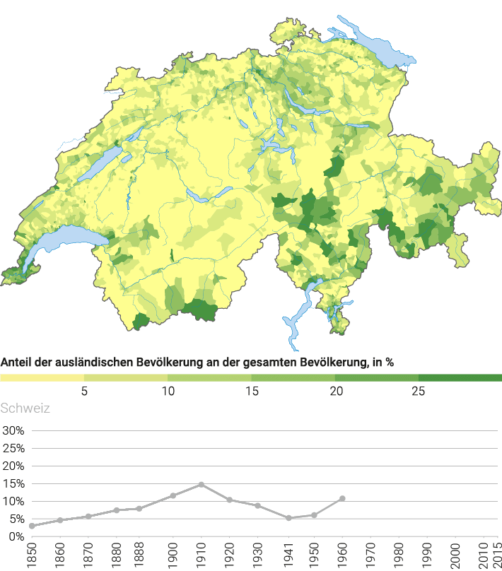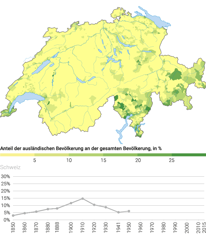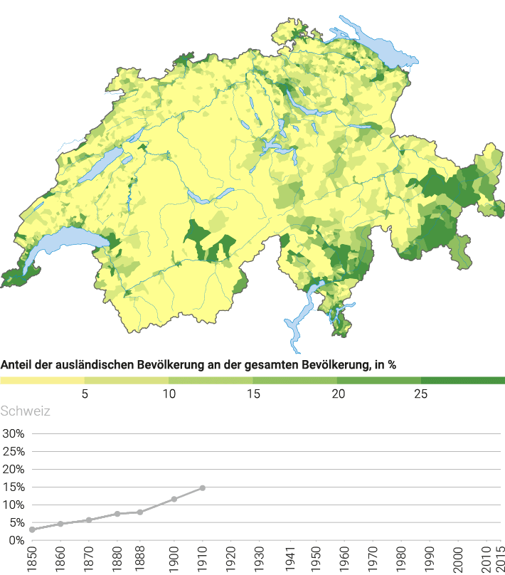 1910 lag der Ausländeranteil schweizweit bei knapp 15%. In den Jahrzehnten vor dem Ersten Weltkrieg entwickelte sich die Zuwanderung von Arbeitskräften in die Schweiz erstmals zu einem Breitenphänomen.
