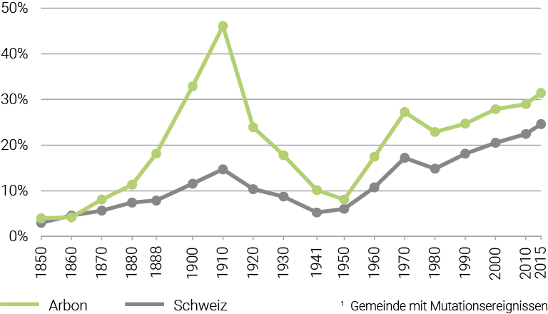 Diese Grafik zeigt die Entwicklung des Ausländeranteils in Arbon im Vergleich zum Ausländeranteil der Schweiz von 1850 bis 2015.