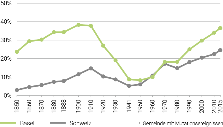 Auch im Vergleich zu den anderen grösseren Städten der Schweiz hatten im jungen Bundesstaat Genf und Basel mit Abstand den höchsten Ausländeranteil. Noch bis zum Ersten Weltkrieg entwickelten sich die beiden grenznahen Universitätsstädte ähnlich. Danach sackte der Anteil der ausländischen Bevölkerung Basels jedoch richtiggehend ab, von knapp 40% 1910 auf unter 10% 1941.