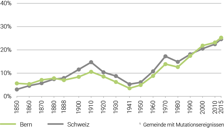 Diese Grafik zeigt die Entwicklung des Ausländeranteils in Bern im Vergleich zum Ausländeranteil der Schweiz von 1850 bis 2015.