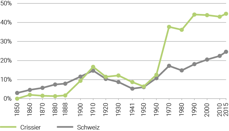 Diese Grafik zeigt die Entwicklung des Ausländeranteils in Crissier im Vergleich zum Ausländeranteil der Schweiz von 1850 bis 2015.