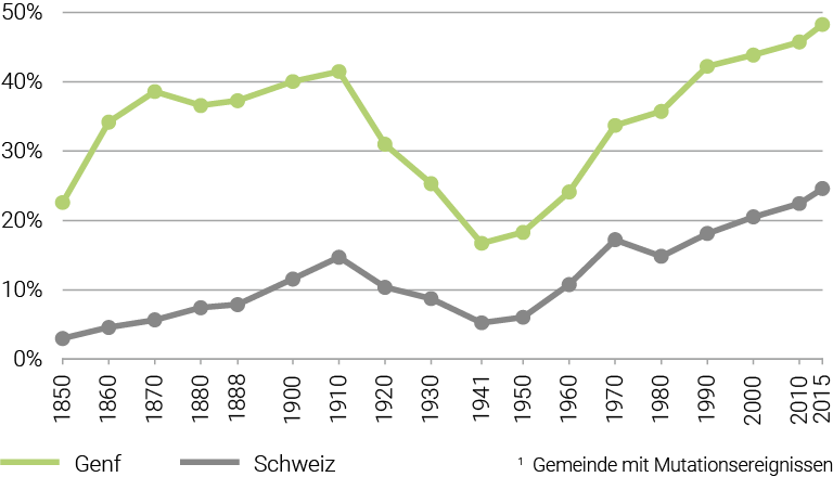 Diese Grafik zeigt die Entwicklung des Ausländeranteils in Genf im Vergleich zum Ausländeranteil der Schweiz von 1850 bis 2015.