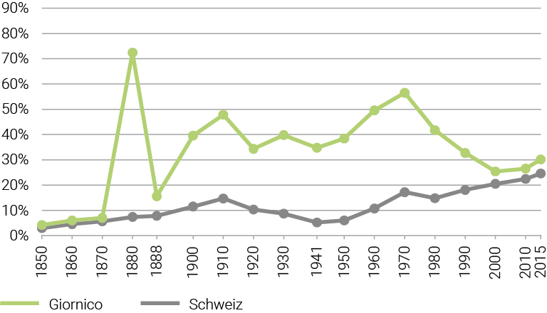 Diese Grafik zeigt die Entwicklung des Ausländeranteils in Giornico im Vergleich zum Ausländeranteil der Schweiz von 1850 bis 2015.
