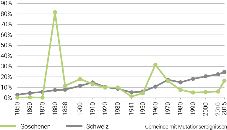 Diese Grafik zeigt die Entwicklung des Ausländeranteils in Göschenen im Vergleich zum Ausländeranteil der Schweiz von 1850 bis 2015.