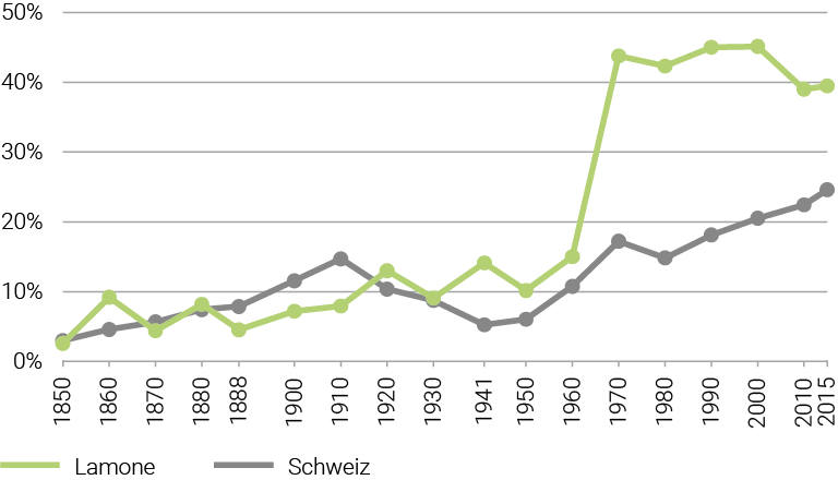 Diese Grafik zeigt die Entwicklung des Ausländeranteils in Lamone im Vergleich zum Ausländeranteil der Schweiz von 1850 bis 2015.