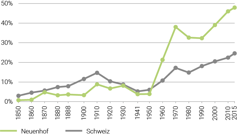 Diese Grafik zeigt die Entwicklung des Ausländeranteils in Neuenhof im Vergleich zum Ausländeranteil der Schweiz von 1850 bis 2015.