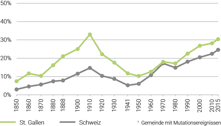 Diese Grafik zeigt die Entwicklung des Ausländeranteils in St. Gallen im Vergleich zum Ausländeranteil der Schweiz von 1850 bis 2015.