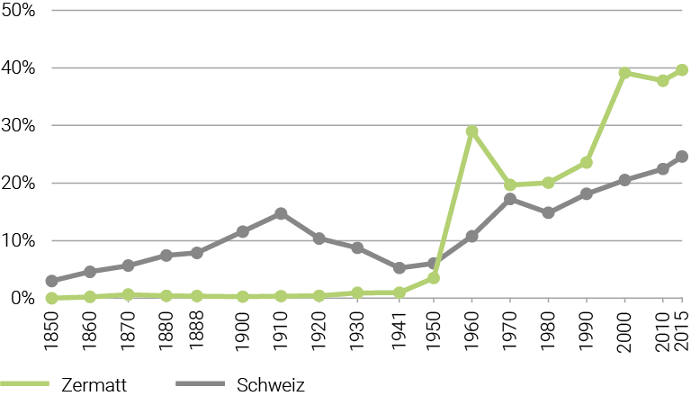 Diese Grafik zeigt die Entwicklung des Ausländeranteils in Zermatt im Vergleich zum Ausländeranteil der Schweiz von 1850 bis 2015.