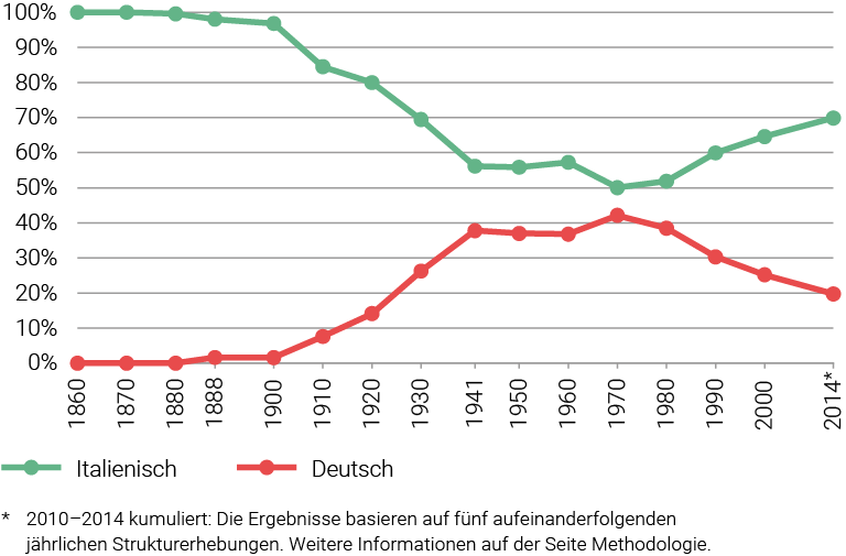 Seit 2010 basiert die Information zur Sprache auf zusammengefassten Stichproben aus mehreren Jahren (kumulierte Daten der Strukturerhebungen 2010-2014). Weitere Informationen dazu finden Sie auf der Methodenseite.