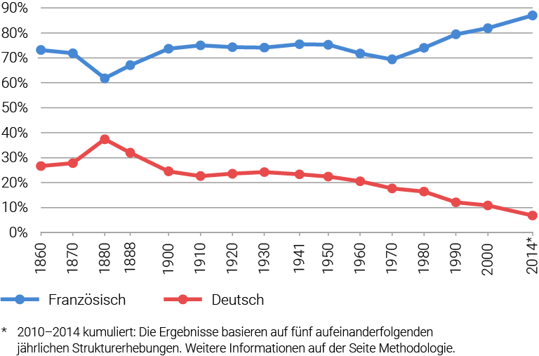 Das Französische vermochte sich seit Mitte des 19. Jahrhunderts nicht über den damaligen Sprachraum hinaus auszubreiten, obwohl der Anteil Französischsprachiger in den vergangenen Jahrzehnten leicht zunahm.