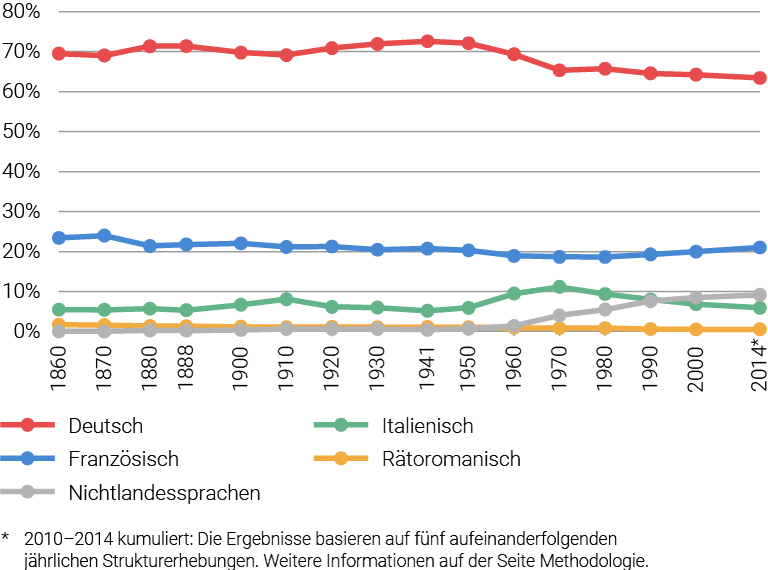 Die Stellung des Deutschen als Sprache, die in der Schweiz am häufigsten verwendet wird, blieb von der ersten Volkszählung bis zur Gegenwart unangetastet: Stets sprachen rund zwei Drittel der Bevölkerung Deutsch. Allerdings kam es nach 1960 zu einem Rückgang auf rund 63%, während der Anteil der Personen wuchs, die eine Nichtlandessprache sprechen, ebenso der Anteil der Französischsprachigen.